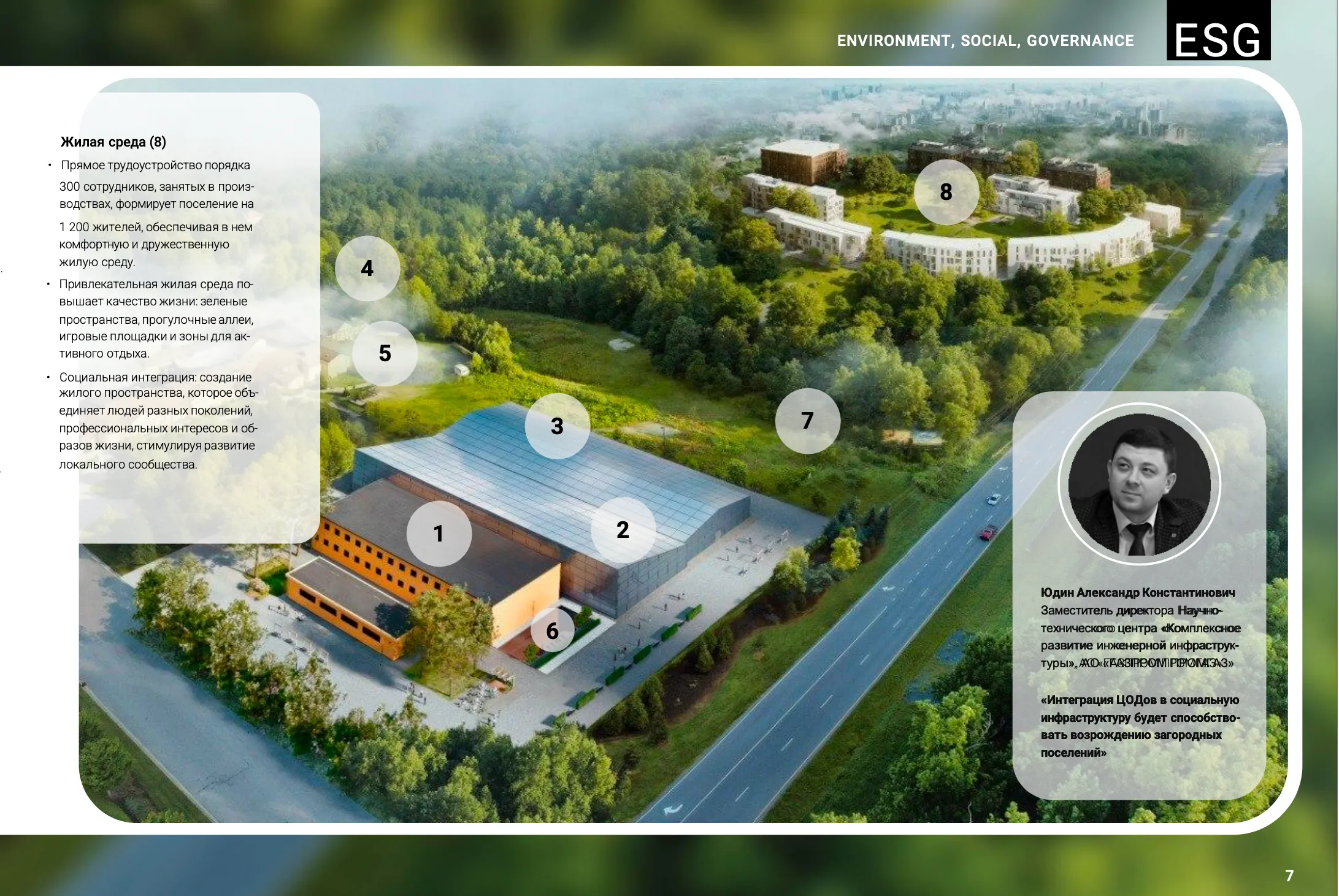ESG-ЦОД и Жилая Среда — первая в России модель, где центр обработки данных становится не только вычислительным ядром, но и основой устойчивого поселения. Вместо сброса тепла и выбросов CO₂ он преобразует их в ресурсы: обогревает теплицы, аквафермы, профилактории, жилые дома и школы. Проект объединяет цифровую инфраструктуру, локальное производство и дружественную среду для жизни, соответствующую принципам человеко-ориентированного подхода Green Zoom и Socio Zoom.