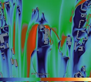 Анализ коэффициента уровня пешеходного комфорта В ходе исследования была выполнена оценка ветровых условий на территории проектируемого здания. Основное внимание уделялось выявлению зон с повышенной скоростью ветра и турбулентностью, способных вызывать дискомфорт у пешеходов. В частности, анализировались: