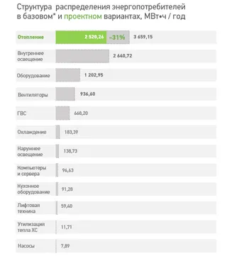 Базовый вариант Здание промышленного технопарка, построенное по базовым нормативам, демонстрирует следующую структуру годовых энергозатрат. Крупнейшими потребителями в базовом варианте являются следующие инженерные системы: отопление; внутреннее освещение; оборудование; вентиляторы. Именно на эти системы следует сосредоточить основные усилия для повышения энергоэффективности и энергосбережения.