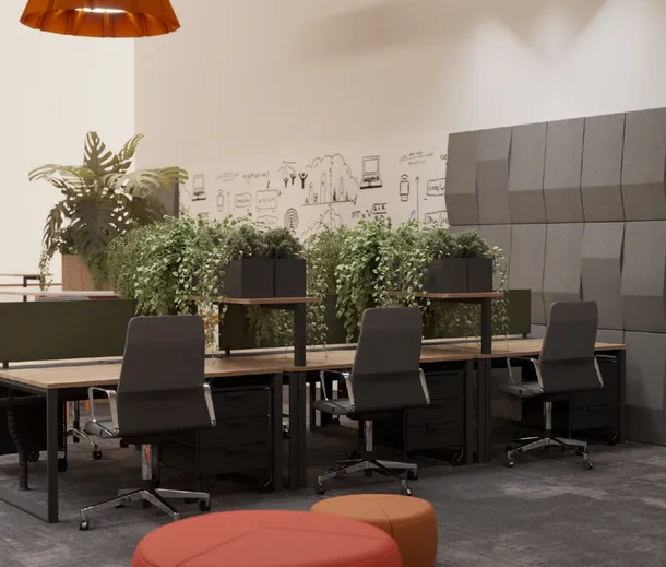 Общественные пространства наполнены озеленением и естественным светом, который проникает через большие витражи. Производственные пространства выполнены в светлых тонах, а источниками естественного света являются световоды, которые создают более равномерное распределение света, не вызывают бликов и уменьшают тени.