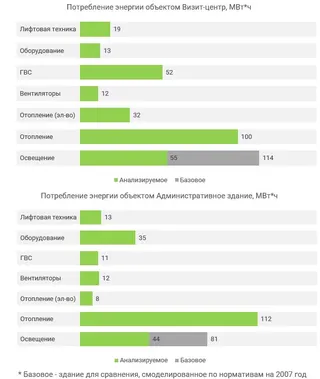 Общие результаты моделирования Когда энергетическая модель готова, программа моделирует жизненный цикл объекта за один год. В результате мы узнаем, сколько энергии удалось сэкономить благодаря применению энергоэффективных решений. С помощью энергетического моделирования удалось выяснить, что в рассматриваемых объектах, визит-центр и административное здание, энергоэффективные решения экономят 89 МВт*ч и 61 МВт*ч соответственно. В относительных единицах - это 24% и 20% .