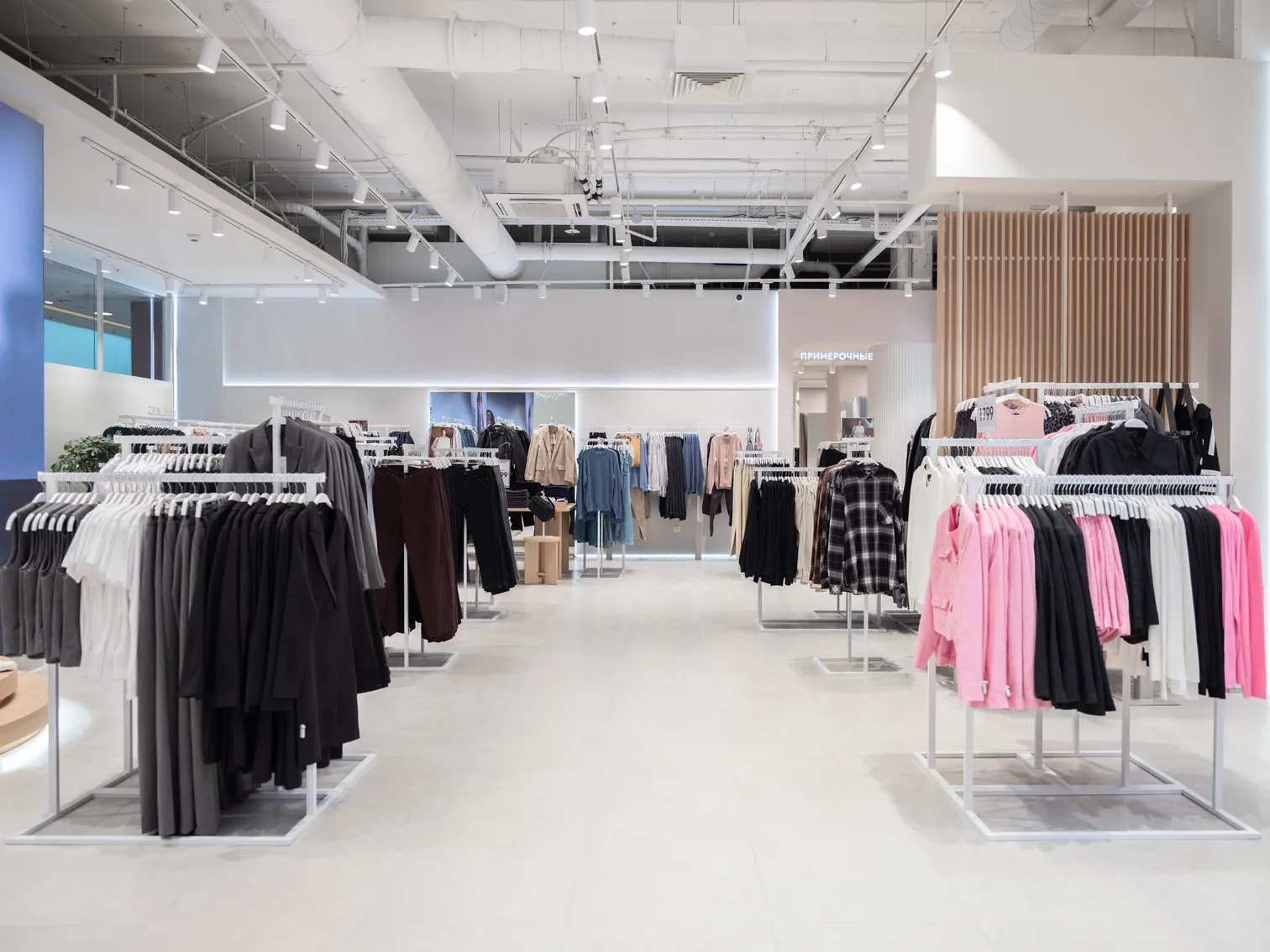 Магазин «Zarina», расположенный в ТРЦ «Галерея» в Санкт-Петербурге, стал первым объектом, прошедшим сертификацию по стандарту GREEN ZOOM Среда. Магазин сочетает в себе все 3 принципа устойчивого развития: экономическую целесообразность, заботу об экологии и человеке. Для того, чтобы разобраться, как удалось создать устойчивую среду в рамках одного магазина на территории торгового центра, необходимо присмотреться к деталям. С первого взгляда можно отметить просторный торговый зал, создающий ощущение спокойствия. Такой эффект достигнут за счет использования в интерьере светлых природных оттенков, фактур, которые не режут глаз, и широких проходов, обеспечивающих свободу передвижения и хороший обзор. Связь с природой отражается не только в цветовых сочетаниях, но и благодаря использованию естественных текстур дерева и камня в элементах мебели, отделке и округлым формам без острых углов, а также проекции изображения кроны дерева в зоне примерочных. Для посетителей предусмотрены зоны отдыха с мягкими диванами и креслами, в примерочных также подумали о человеке - есть полочки для телефона, а форма штанг для шторок спроектирована так, чтобы обеспечить полную приватность.