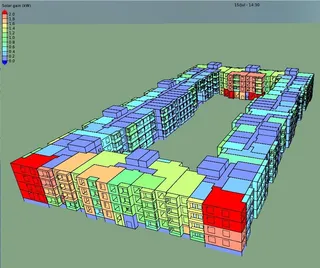 Теплопоступления от инсоляции В результате моделирования мы получаем большое разнообразие информации об энергетических процессах в здании. Например, расчет энергии солнца, поступающей в помещения через ограждающие конструкции. На визуализации справа красные помещения получают больше солнечной энергии. Фиолетовые – меньше.