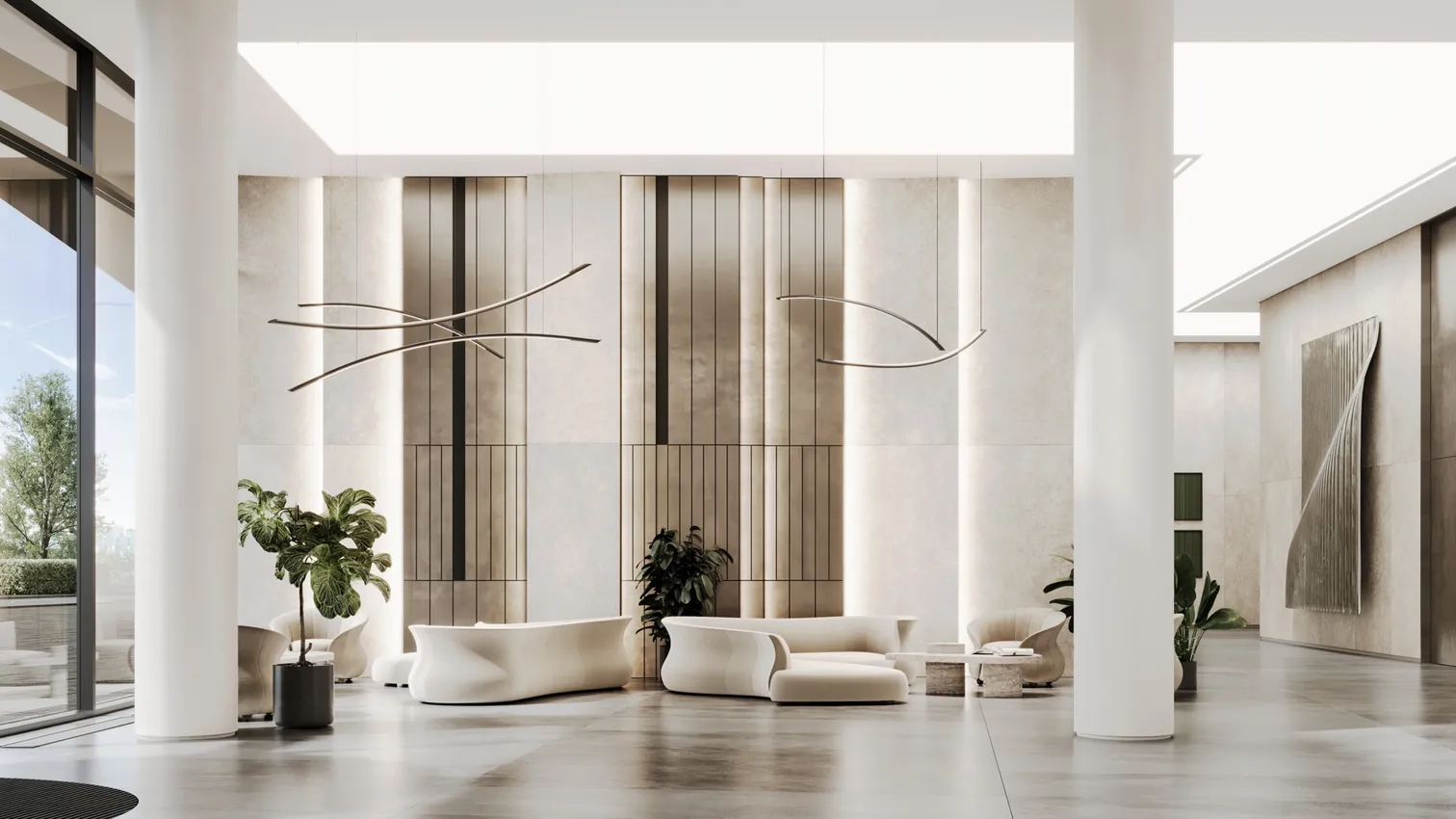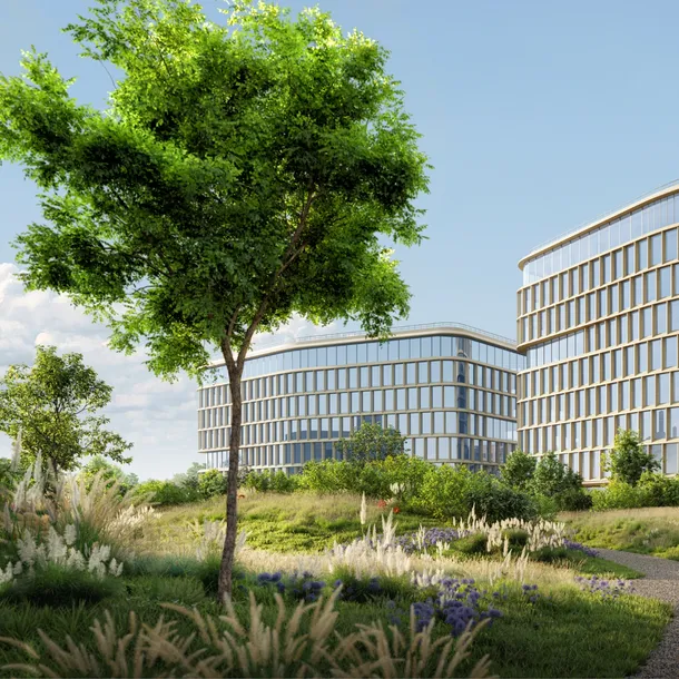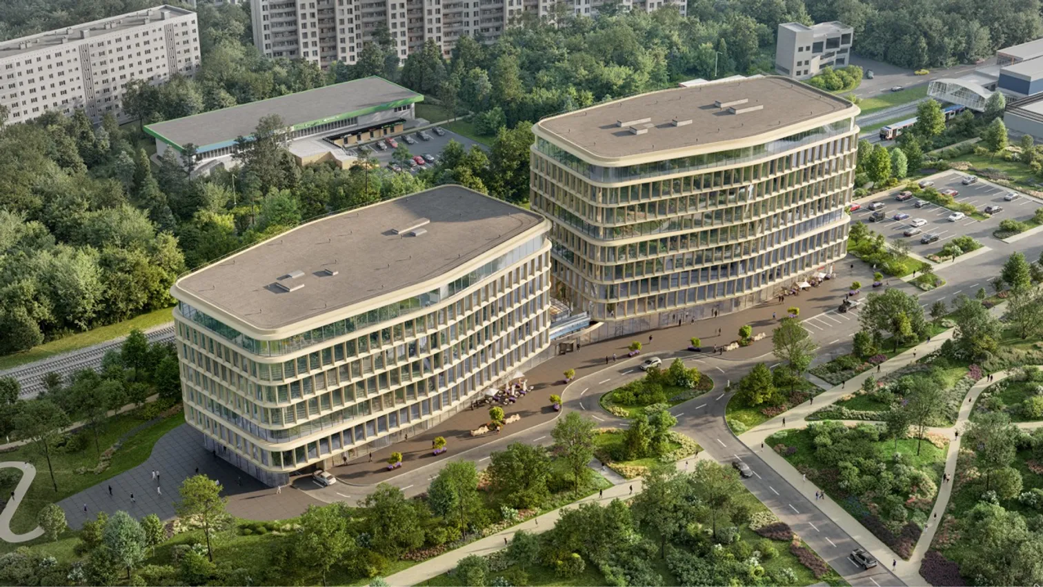 Бизнес-центр отличается элегантным архитектурным решением, в котором обтекаемые формы фасадов, выполненные из светлого фибробетона, сочетаются с масштабным использованием витражного остекления. Такой подход обеспечивает его гармоничную интеграцию в окружающую среду. Архитектурная концепция, основанная на принципах соразмерности и природоориентированности, позволяет зданию органично вписаться в ландшафт прилегающего природного парка.
