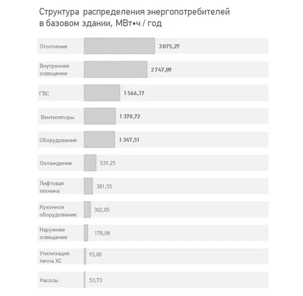 Здание многофункционального офисно-делового комплекса, основанное на проектных решениях, но адаптированное согласно базовым нормативам, демонстрирует, что наиболее значимыми категориями энергопотребления были:
