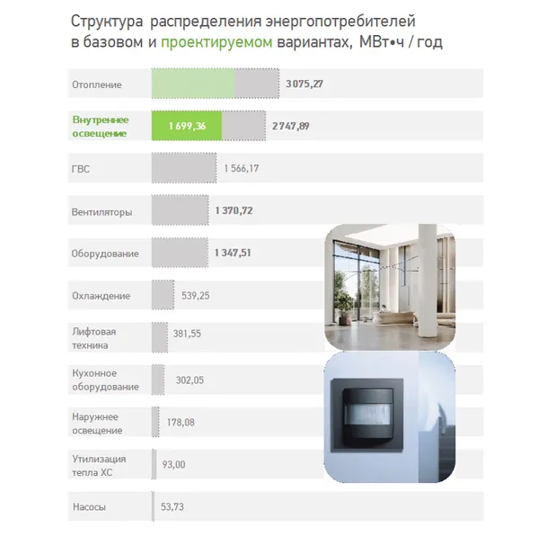 Внутреннее освещение – вторая по значимости категория энергопотребления в многофункциональном офисно-деловом комплексе.