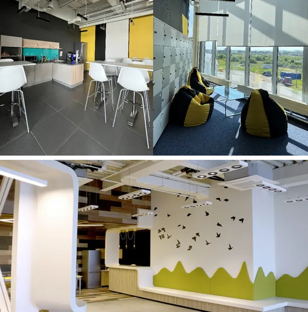 Забота о сотрудниках компании проявляется не только в создании удобных рабочих мест, но и в возможности отдохнуть в обеденный перерыв. На первом этаже здания размещено комфортное кафе с доступом к питьевой воде, холодильником и микроволновкой. Кафе доступно также и для посетителей офиса. Для сотрудников офиса в здании также предусмотрено несколько кофе-пойнтов. В свободное время можно расслабиться в зонах отдыха и побеседовать на отвлеченные темы.