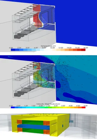 В процессе проектирования было произведено математическое моделирование потоков воздуха в объеме ЦОД, а также в камере смешения перед его подачей к установкам модулей обработки воздуха для машинного зала (MNFC). Благодаря математическому моделированию предложена оптимальная конструкция смесительной камеры, отвечающая заявленным требованиям – температура воздуха в камере смешения не должна была опускаться ниже +7 градусов, что обусловлено эксплуатационными характеристиками рекуперативных теплообменников, куда поступает воздух после камеры смешения. При строительстве это позволило сократить капитальные вложения в инженерию ЦОД.
