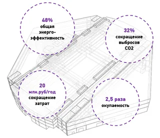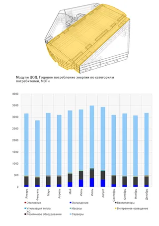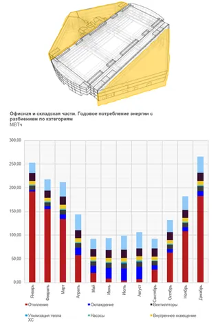 Основным потребителем энергии в офисной и складской частях здания являются системы отопления. Применение термостатических регуляторов на отопительных приборах и погодозависимого графика регулирования температуры теплоносителя в котельной позволило почти в два раза сократить потребление энергии на отопление в отопительный период. Дополнительное сокращение потребления энергоресурсов, в том числе газа, возможно при реализации технических решений по использованию сбросного тепла ЦОД для отопления офисного пространства.
