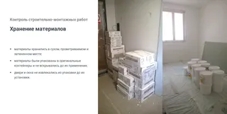 материалы хранились в сухом, проветриваемом и затененном месте; материалы были упакованы в оригинальные контейнеры и не вскрывались до их применения; двери и окна не извлекались из упаковки до их установки.