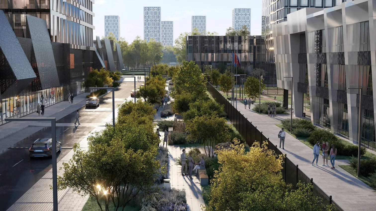 Концепция благоустройства предполагает создание участков с разнообразными активностями: дворовая территория предусматривает наличие рабочей зоны и сенсорного сада для спокойного отдыха. Многофункциональный и всесезонный ландшафтный парк, главной чертой которого является близость человека с природой, включает в себя зону с геопластикой, выполняющую роль защитной полосы от проезжей части, зелёный луг. Подобный контакт помогает обеспечивать удобство пребывания и отдыха на территории, положительные эмоции жильцов.