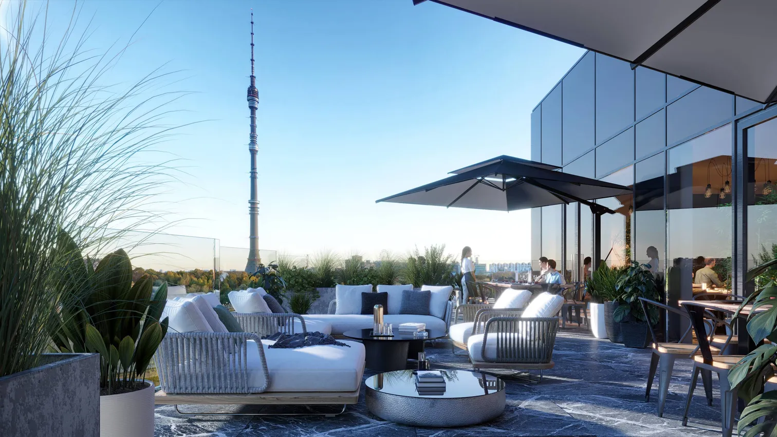 Жителям «Эльбруса» нет необходимости задумываться, где можно отдохнуть и провести время вдалеке от городской суеты. Для максимального использования преимуществ небоскрёба на 55-м этаже для жителей будет обустроена комфортабельная лаунж-зона с кафе и ресторанами, а также персональная смотровая площадка, откуда можно любоваться вечерней Москвой.